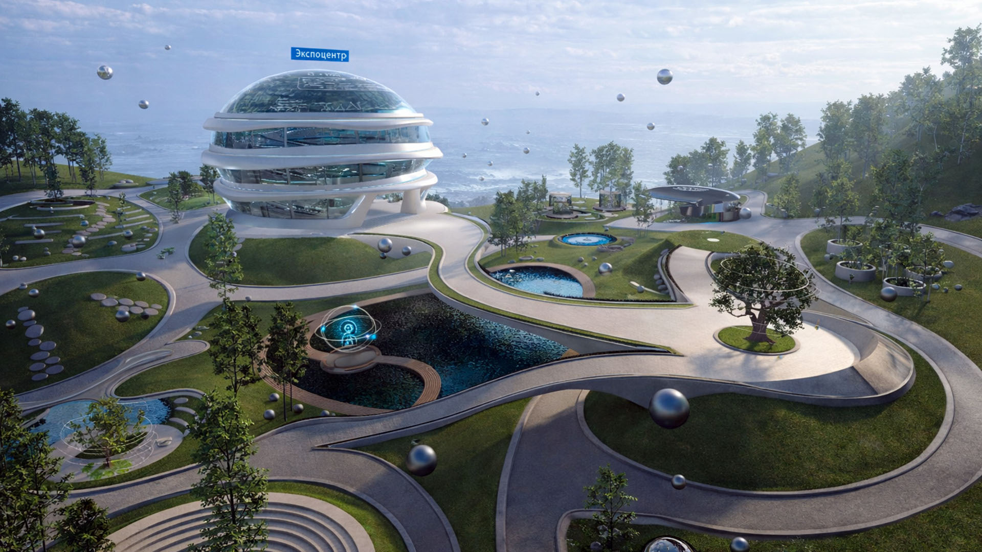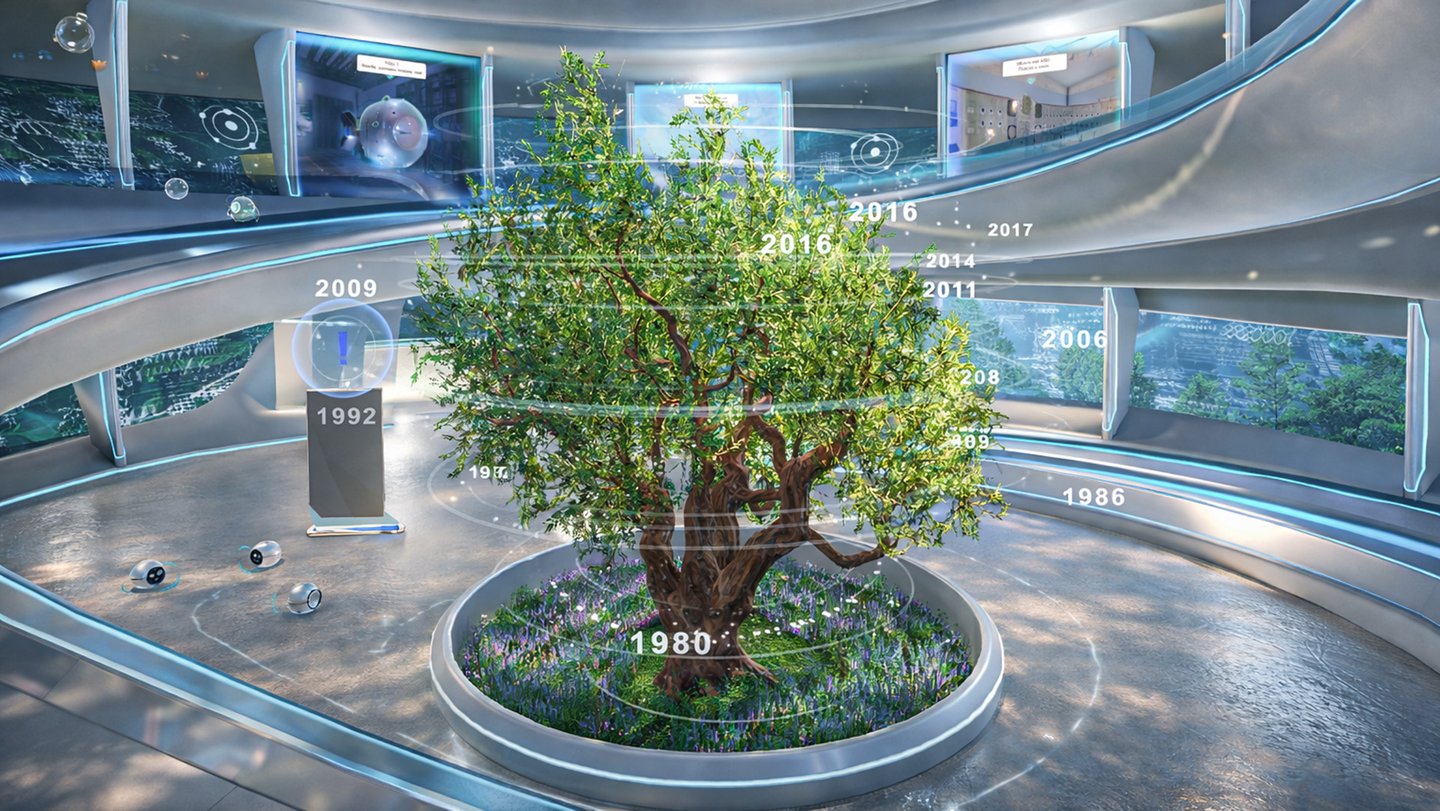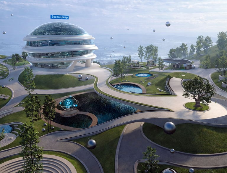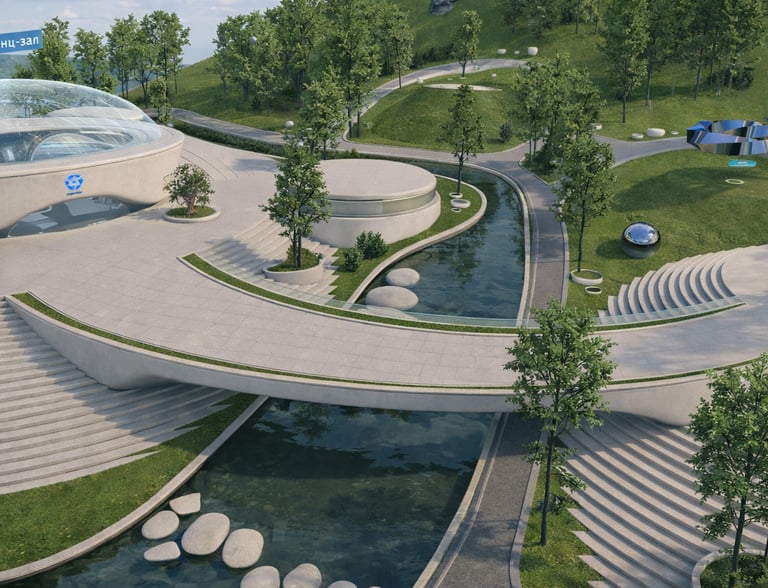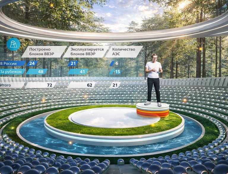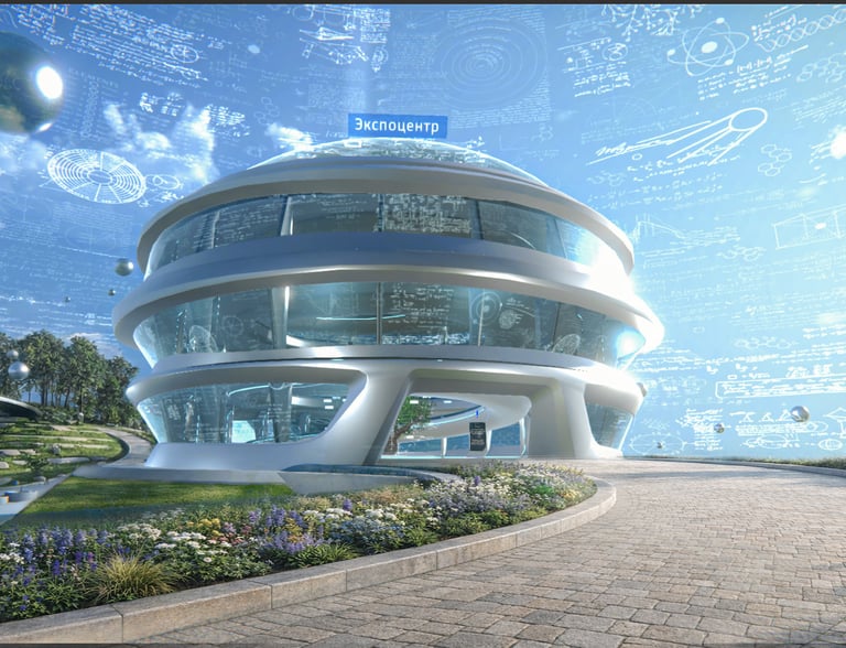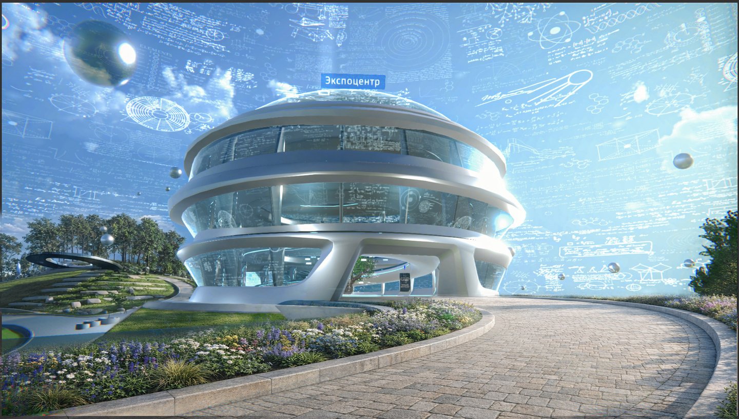 An explorable exhibition space centered around an expo building. Inside, users access portals leading to separate scenes that showcase the company’s work across different domains—energy, medicine, industry, and defense. Each exhibit functions as a self-contained experience while remaining logically connected to the shared world.