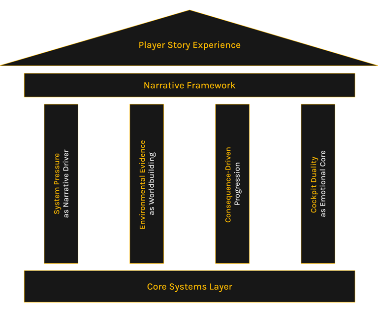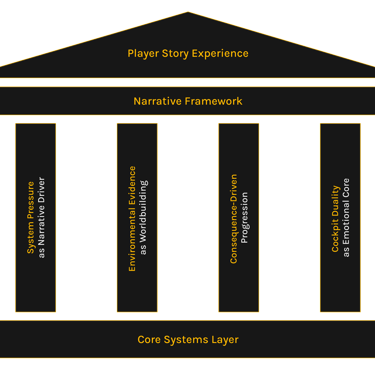 The core pillars—operational pressure, silence, environmental evidence, consequence-driven progression, and mutual dependence—act as constraints that guide every narrative decision. They ensure that tone remains consistent across mechanics, level layout, AI behavior, and pacing. These principles prevent tonal drift by anchoring the story to the helicopter’s physical reality, creating a unified experience where events, reactions, and player actions feel coherently connected. The narrative remains stable because every new system must fit inside the same thematic and mechanical boundaries.