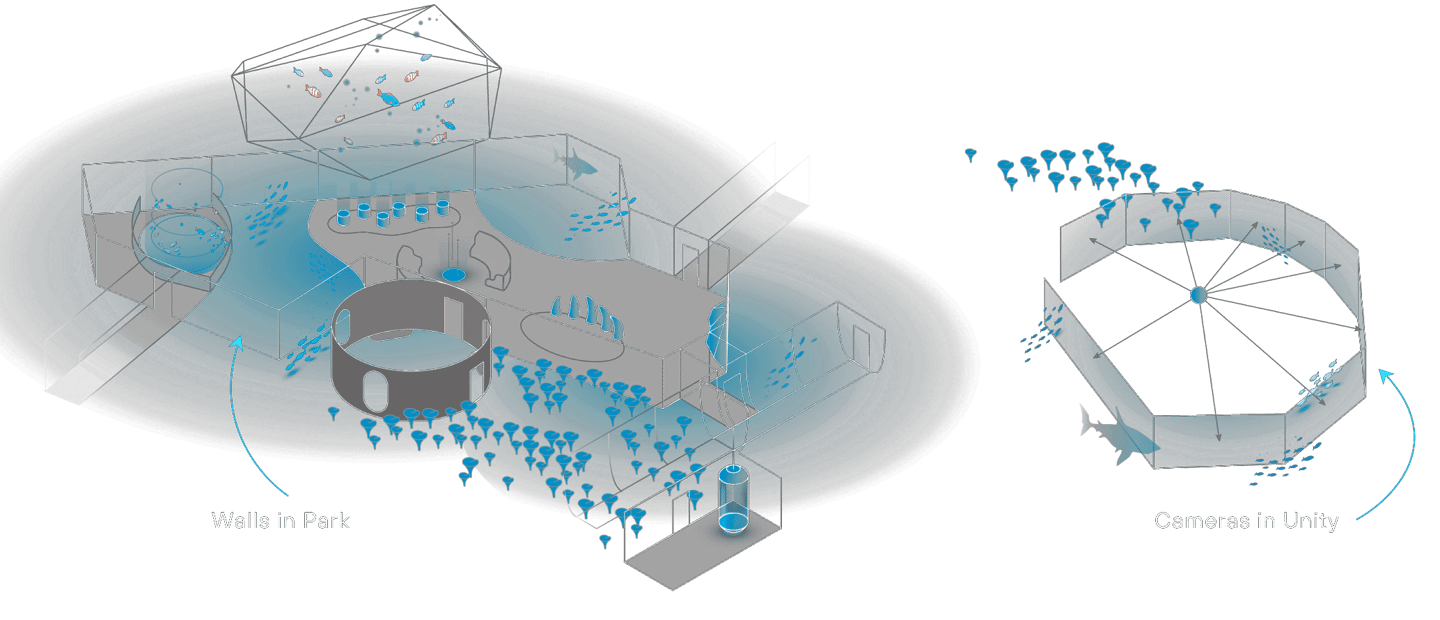 Type: Immersive multi-room interactive park (projection-based, real-time Unity scenes)