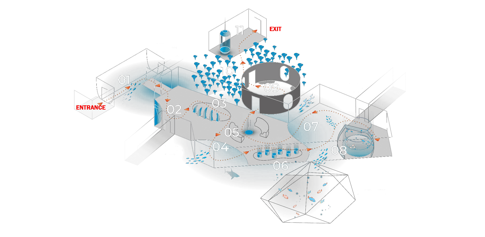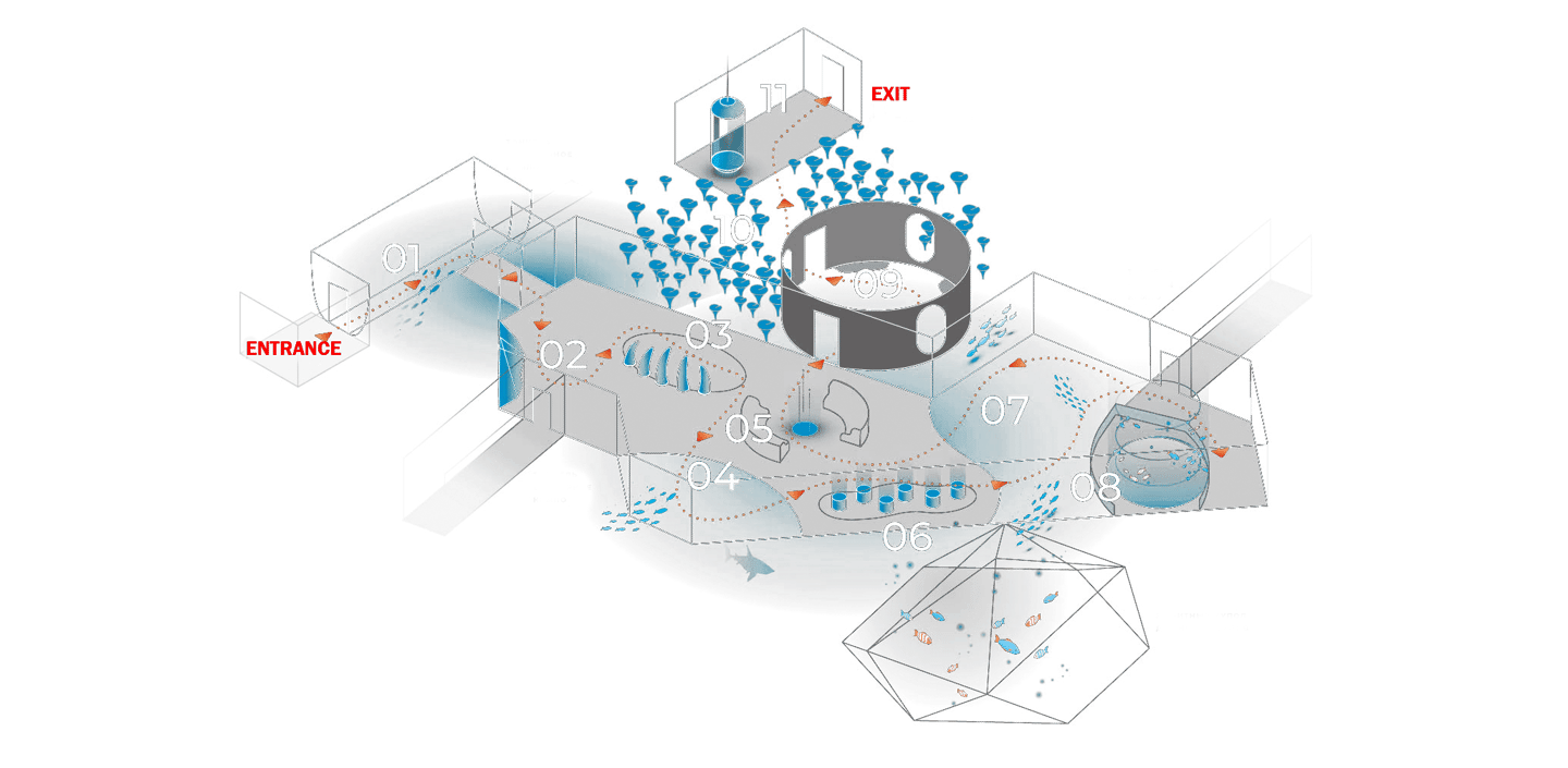 From the descent corridor to the observation decks, interactive laboratory, bathyscaphe journey, and greenhouse, the park is structured as one coherent environment with shifting tone and scale. I defined the structure of this world and built the prototype that established its look, behavior patterns, and the rhythm of how it reveals itself to the visitor.