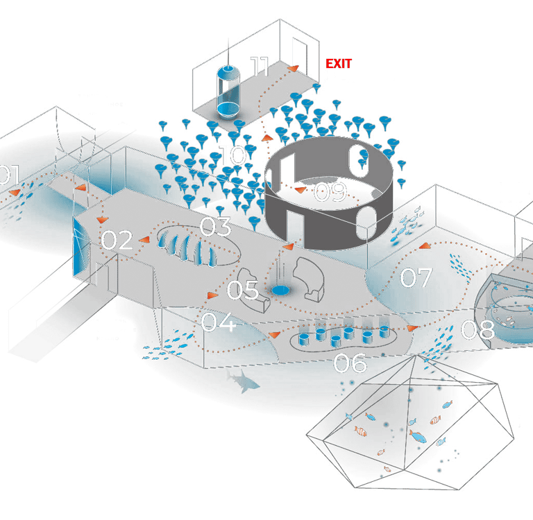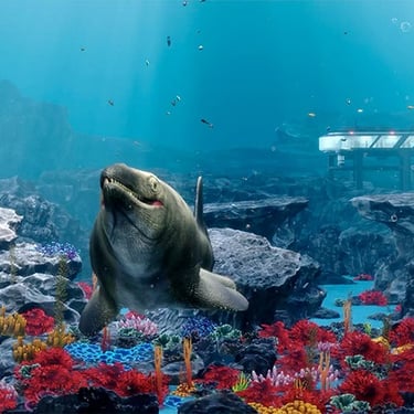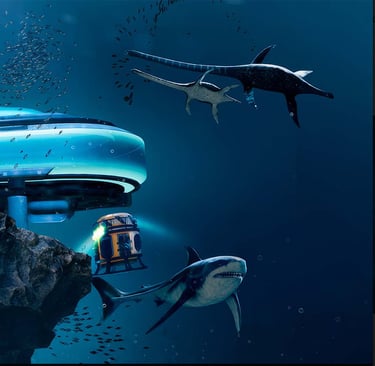 As visitors advance through the base, each room reveals a different angle on the shared prehistoric ocean. Evolution and Paleontology establish context and scale, while Balcony and Laguna introduce tension and spectacle—large silhouettes moving through fog, schools reacting to presence, and predators appearing from deeper layers. These early zones frame the environment as something alive and reactive, not just a backdrop, and set the pacing for how the world unfolds.