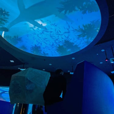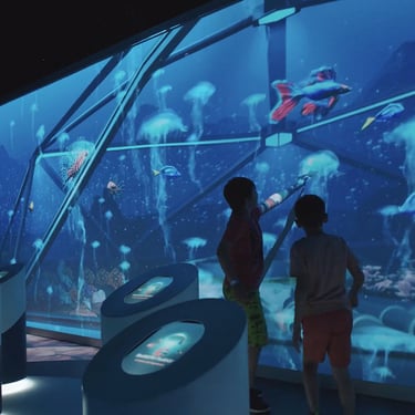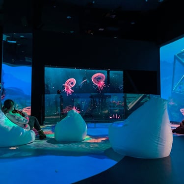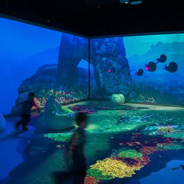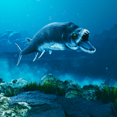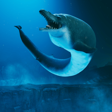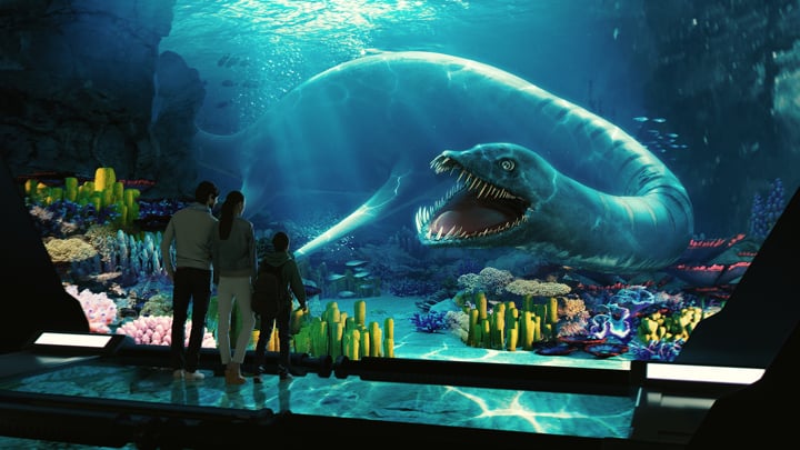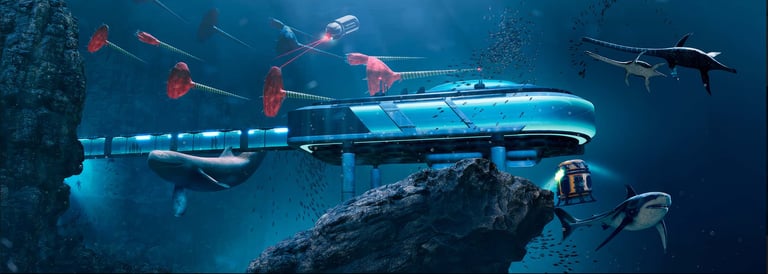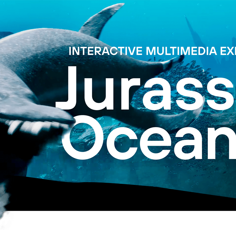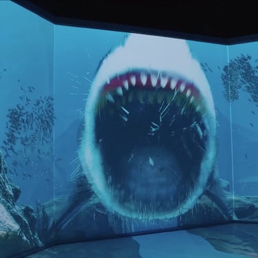 Jurassic Ocean invites visitors into an imagined underwater research base studying life in a prehistoric ocean. Through large projection “windows,” the experience reveals a continuous real-time world populated by ancient marine creatures—schools of early fish, unfamiliar invertebrates, and large predators such as mosasaurs and megalodon drifting through layered depth, where their silhouettes emerging and fading in distant fog.