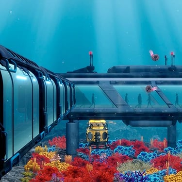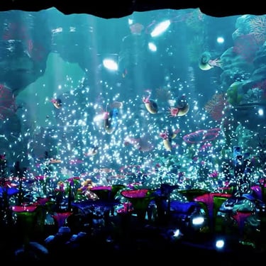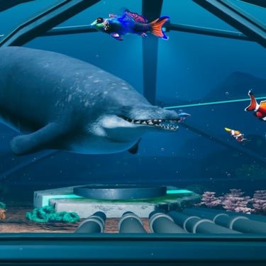 I shaped how the ocean behaves by combining simple systemic rules with a few timed show moments where it made sense. Schooling fish relied on steering and avoidance logic, and larger animals followed broad patrol routes that let them drift in and out naturally. Some installations had staging elements for the suspense, like megalodon reacting to visitors on the balcony. The balance of systems and scripting kept the world plausible while still supporting the moments that needed a bit more tension.