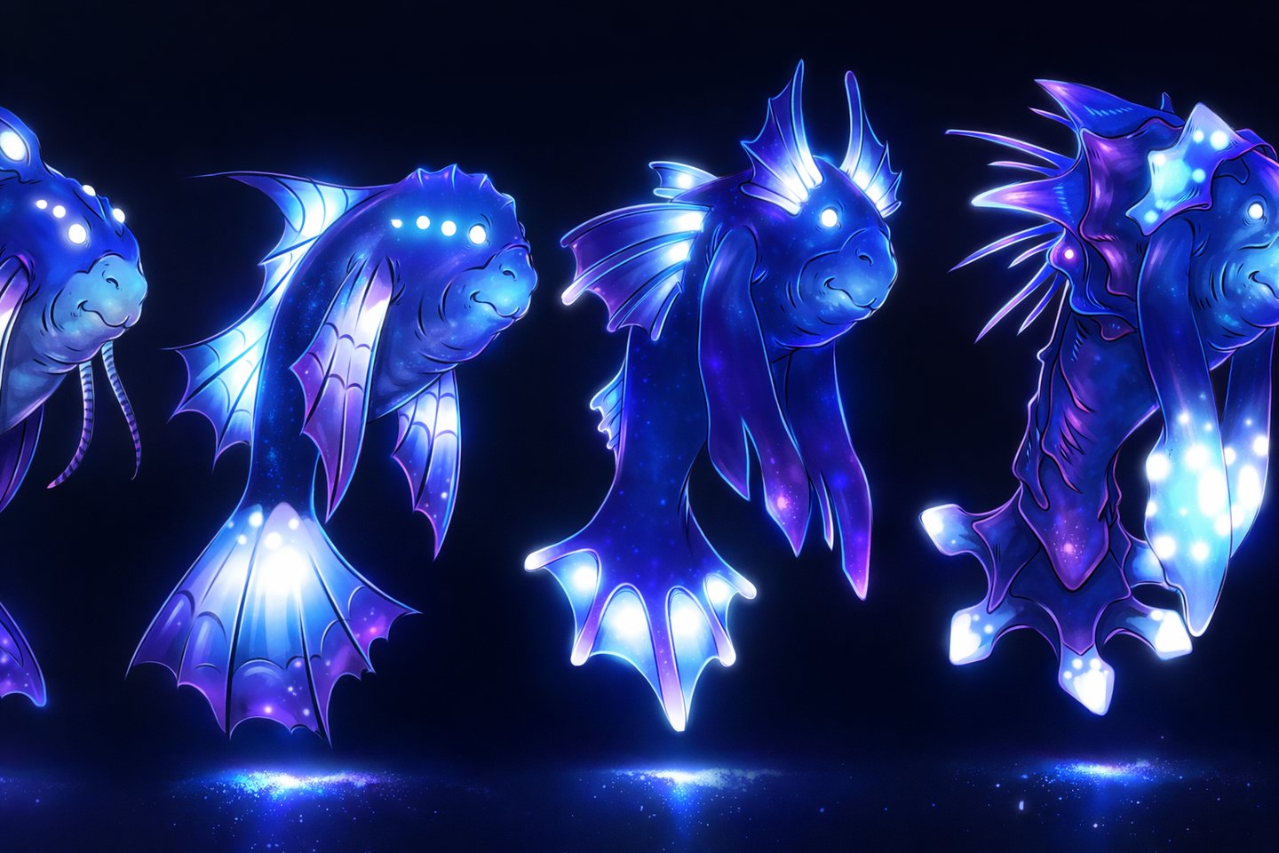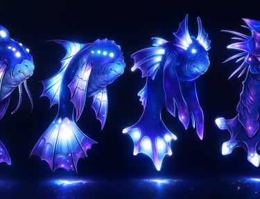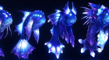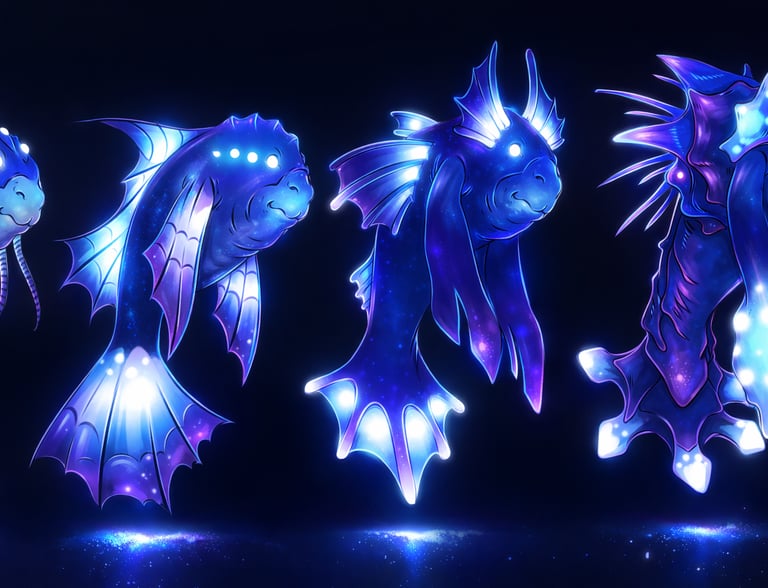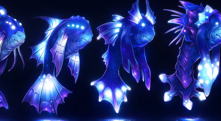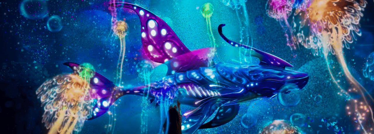 I defined the visual language of the park and established rules that guided asset creation across environments and creatures. Early creature concepts leaned toward alien forms, but after testing reactions, I shifted the foundation toward recognizable underwater animals—such as manatees, axolotls, and stingrays—layered with fantasy through glow, color schemes, additional fins, and surface detail. The overall visual approach relied on contrast between darkness and selective light, using fluorescent accents and glowing elements to express depth, scale, and progression while keeping projections readable in public spaces.
