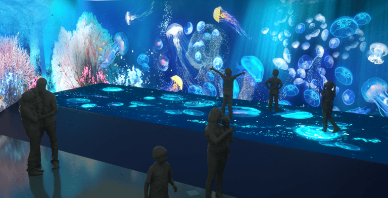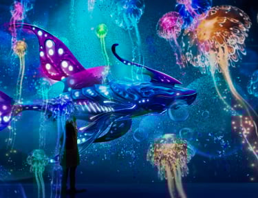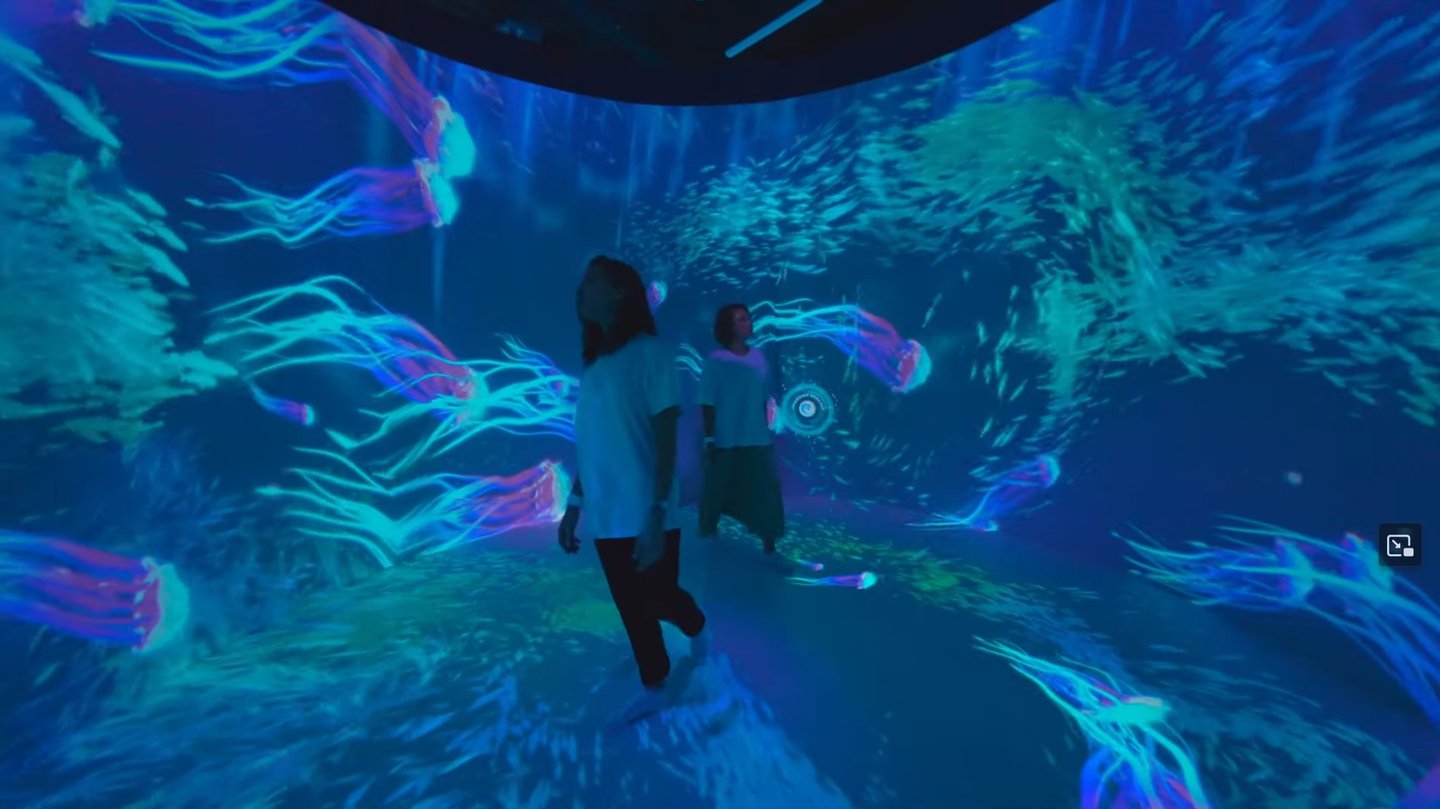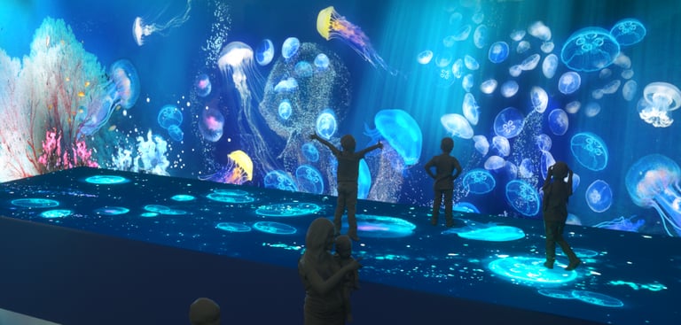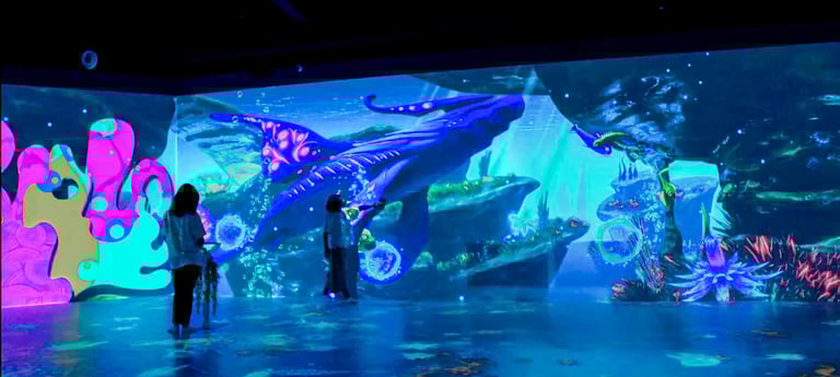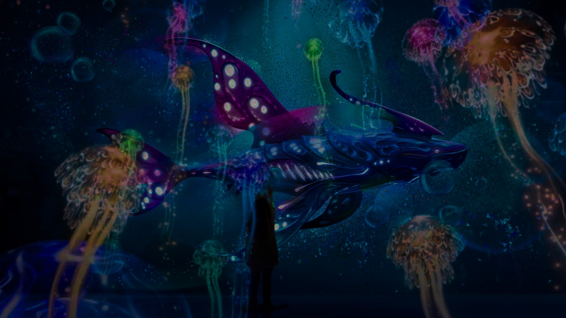 Oceania Planet was designed as a continuous journey through a fantasy ocean world, unfolding across multiple connected spaces with large-scale projections on walls, floors, and semi-transparent surfaces. The experience was structured to progress from lighter, welcoming environments into darker, deeper spaces, using changes in light, scale, and motion to guide emotional pacing rather than explicit narrative cues.
