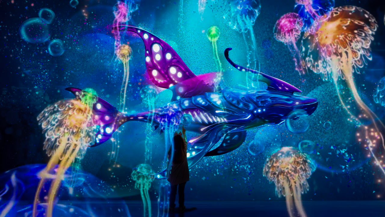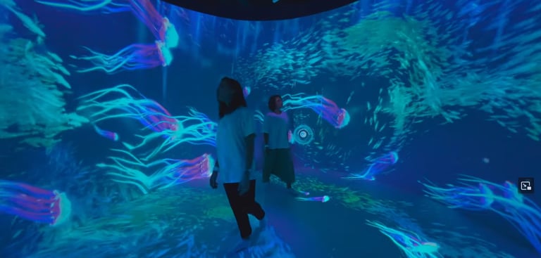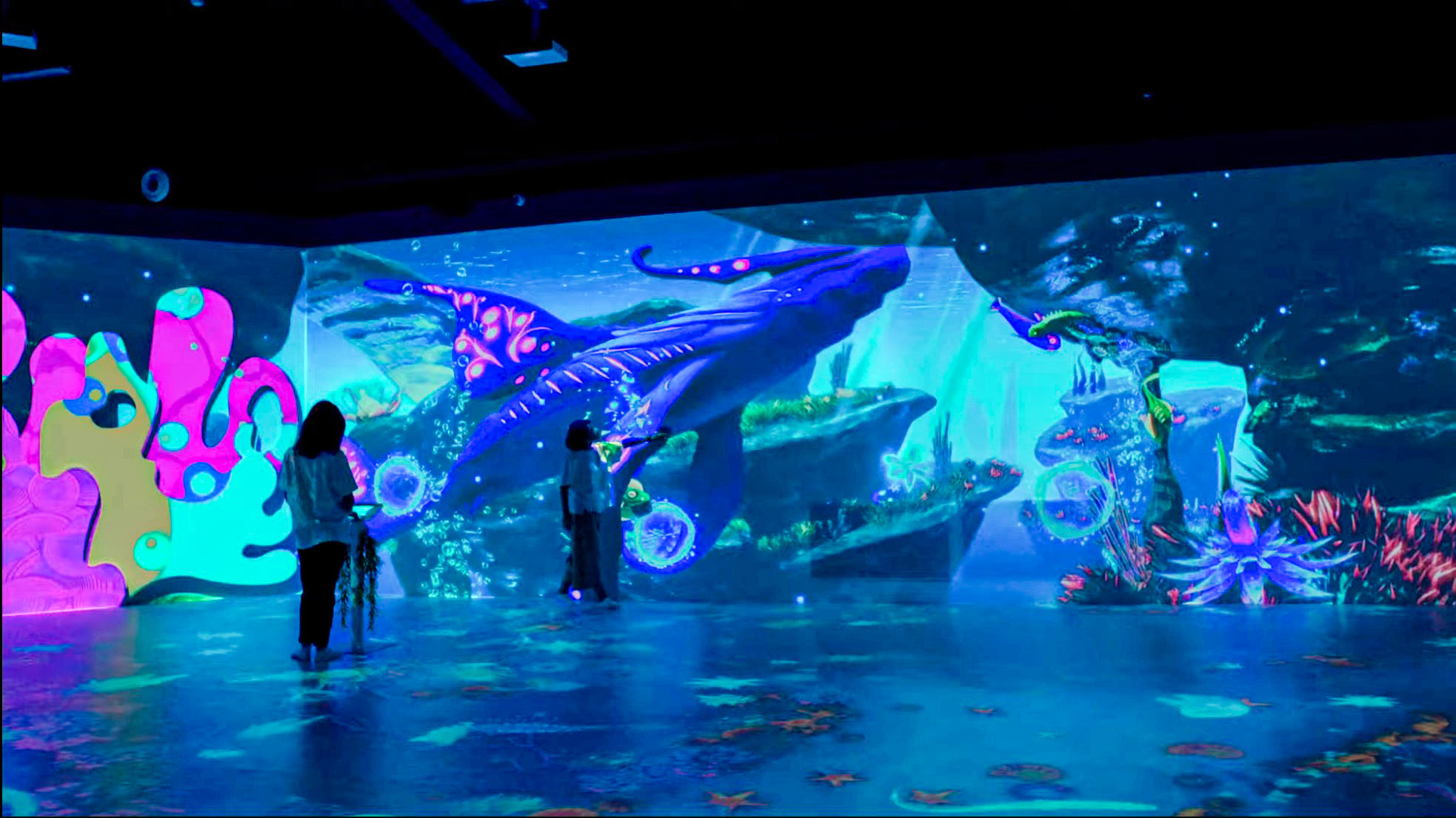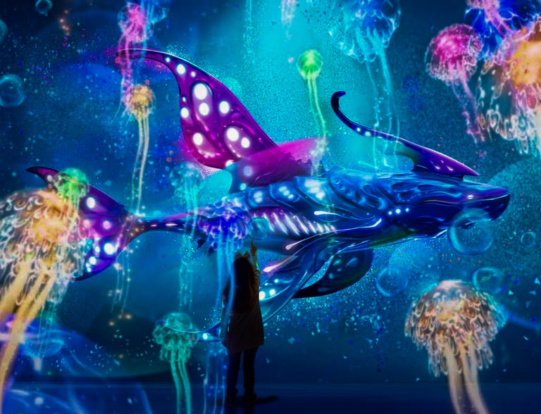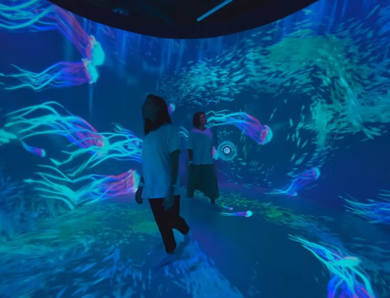 Oceania Planet was designed as a continuous journey through a fantasy ocean world, unfolding across multiple connected spaces with large-scale projections on walls, floors, and semi-transparent surfaces. The experience was structured to progress from lighter, welcoming environments into darker, deeper spaces, using changes in light, scale, and motion to guide emotional pacing rather than explicit narrative cues.