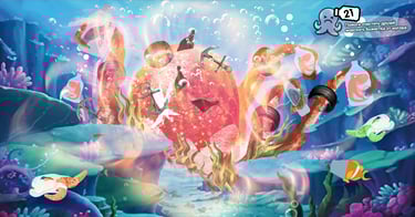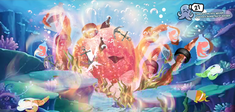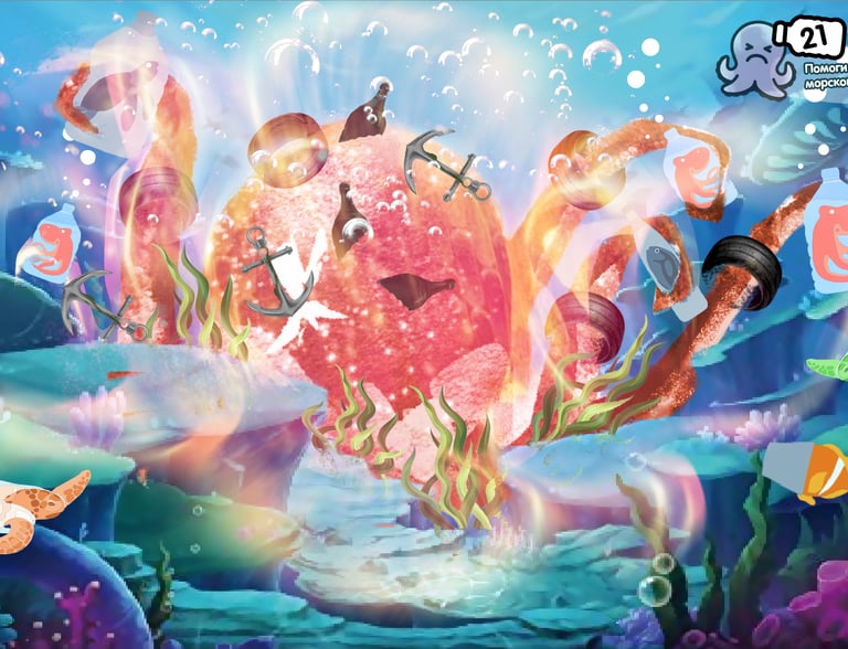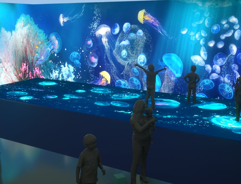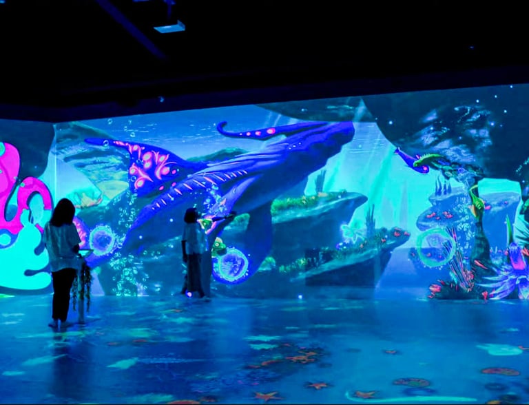 A phygital fantasy-ocean park built as a persistent interactive world in Unity—projected into physical space and played through presence, gestures, and lightweight games.