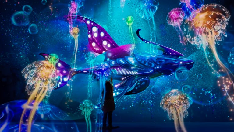 I shaped Oceania Planet as a narrative journey that unfolds through space rather than explicit storytelling. The experience progresses from calm, inviting environments into darker and more uncertain depths, and later resolves toward openness and light at the surface. This arc guided decisions about lighting, color saturation, creature presence, motion intensity, and sound across all zones, allowing visitors to perceive a complete journey even when moving freely or encountering spaces out of order.