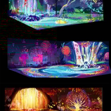 The main zone’s floor projection required extreme performance discipline. The setup used twelve projectors to deliver an 8K floor image with overlapping angles to minimize visitor shadows. This imposed strict constraints on rendering cost, shader complexity, and effect density, shaping many visual decisions to preserve responsiveness under load.